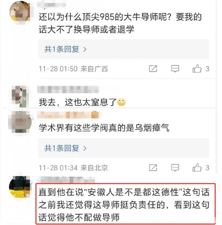 有的东说念主合计导师太不近情面了,条目太尖酸了。话语少量莫得情面味,尤其是出现了地域黑,说安徽东说念主齐是阿谁德行这句话确实不应该说。