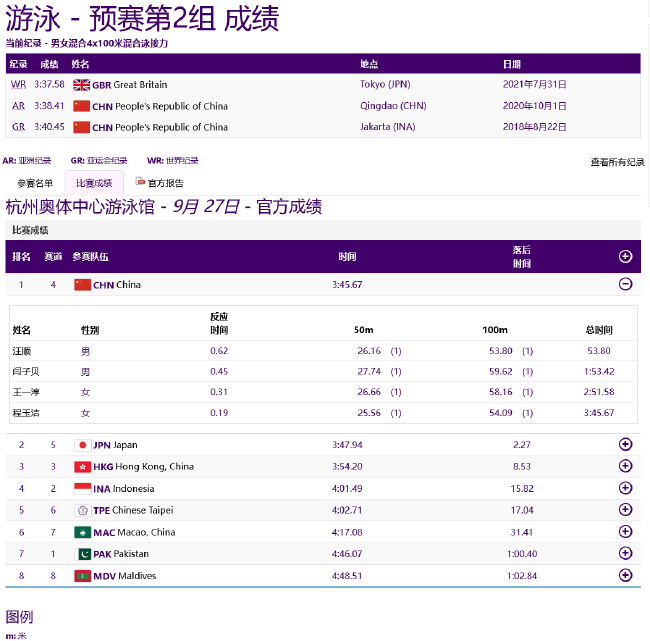 在男女夹杂4x100米夹杂泳发愤于初赛中,由汪顺、闫子贝、王一淳和程玉洁构成的中国队,在第2小组中以3分45秒67名次小组第一,最终以初赛第一的收成晋级决赛。